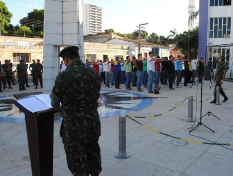 Cerca de 160 jovens foram dispensados de servir às Forças Armadas, na manhã desta quarta-feira (25/05), na Praça Paschoal Moreira Cabral, frente à sede da Câmara de Cuiabá. Concomitantemente, os rapazes fizeram juramento à bandeira. Durante o evento, que durou cerca de 45 minutos, foram entregues Certificados de Dispensa de Incorporação (CDI), antigo Certificado de Reservista.