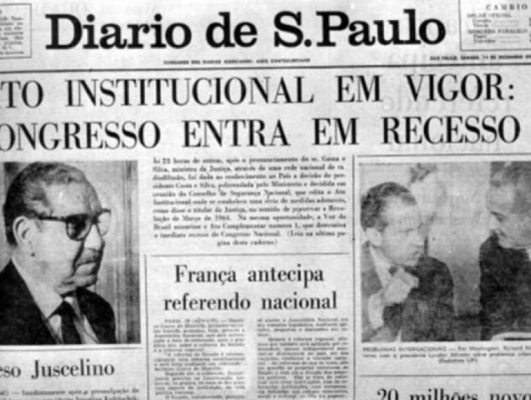 Os governos militares fizeram uso de Atos Institucionais para garantir o poder, diplomas que superavam hierarquicamente as demais leis, inclusive a Constituição, a lei maior de um país. Um dos mais importantes e impactantes atos institucionais no período foi o AI-5, promulgado pelo presidente Artur da Costa e Silva, com o aval do Conselho de Segurança Nacional, no dia 13 de dezembro de 1968, a 50 anos atrás. Para os militares, tal medida foi necessária para que não fossem frustrados os ideais superiores da tal revolução, preservando a ordem, a segurança, a tranqüilidade, o desenvolvimento econômico e cultural, e a harmonia política e social do país comprometidos por processos subversivos e de guerra revolucionária. Entretanto, ele foi para nós, o mais retrógrado e criminoso ato contra os direitos políticos e à democracia.