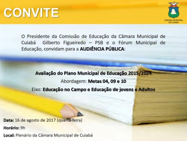 Nesta quarta-feira (16), às 09h00, Plenário das Deliberações, a Câmara Municipal de Cuiabá irá realizar uma audiência pública para debater metas 4, 9 e 10 do Plano Municipal de Educação 2015/2024. A audiência foi requerida pelo presidente da Comissão De Educação, Ciência, Tecnologia, Turismo, Desporto, Meio Ambiente, Cultura, e Patrimônio Histórico, vereador Gilberto Figueiredo para poder debater com a população e profissionais da educação os rumos do ensino no município de Cuiabá.