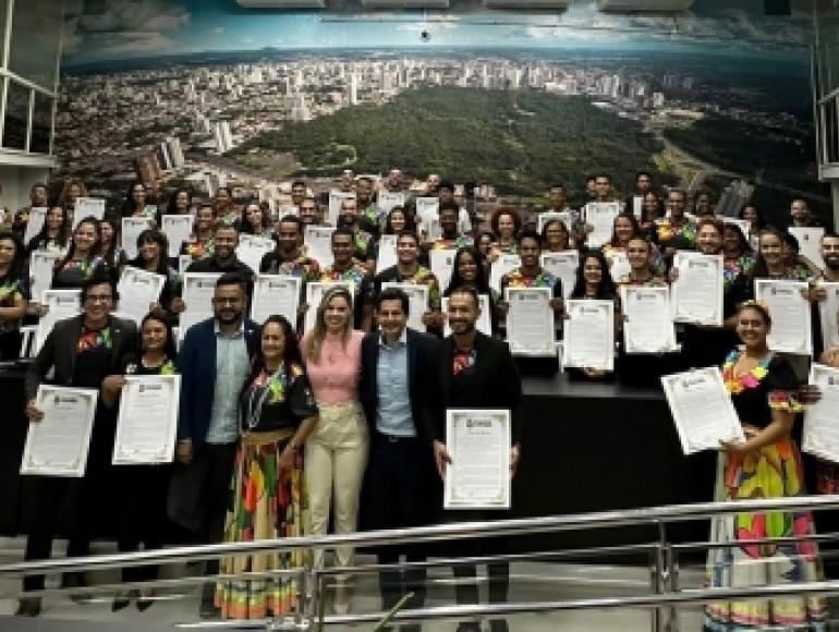 A vereadora Michelly Alencar (UNIÃO) realizou nesta terça-feira (29), uma Sessão Solene em homenagem aos 30 anos do grupo Flor Ribeirinha. A cerimônia reuniu aproximadamente 150 pessoas que fazem parte da comunidade Flor Ribeirinha, incluindo apoiadores, dançarinos, diretores e familiares.