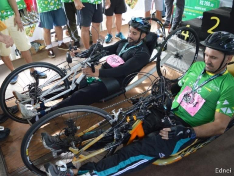 Dois atletas chamaram a atenção do grande público que se concentrou hoje (13) cedo em frente ao prédio da Câmara Municipal de Cuiabá, ponto oficial de largada e finalização da 1a. Corrida do Legislativo: trata-se de Joenil Barros, 35 anos, e Gilberto Zmyslony, 44, participantes na categoria Especial. Eles correram com bicicletas adaptadas (hancycle) a provas semelhantes, espécie de triciclos, com marcha manual, igualmente empregadas como lazer. Ambos elogiaram a iniciativa da Câmara Municipal em promover esse certame esportivo, "mesmo porque já não era sem tempo", comentário de Joenil.