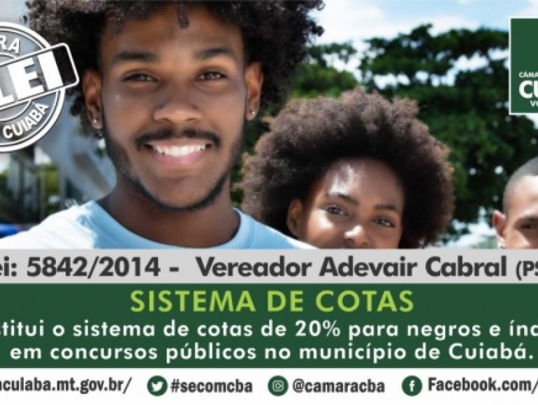 Concursos públicos em Cuiabá possuem cota de 20% para negros e índios. A medida é garantida pela lei 5.842 de julho de 2014, proposta pelo vereador Adevair Cabral (PSDB), a qual segue uma lei federal que reserva 20% das vagas em concursos da administração federal para candidatos que se declararem negros ou pardos.