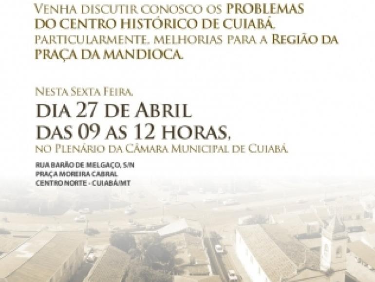Nesta próxima sexta-feira (27), a Câmara Municipal de Cuiabá realizará uma audiência pública para debater sobre as problemáticas da violência, tráfico de drogas, infraestrutura, limpeza entre outros assuntos que afetam a região do Centro Histórico de Cuiabá, particularmente a área da Praça da Mandioca.