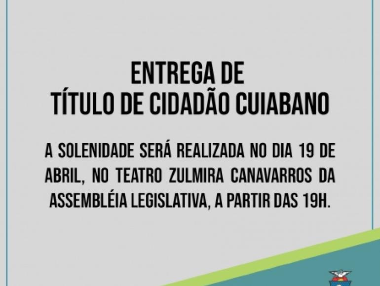 Neste dia (19), a Câmara Municipal de Cuiabá realizará uma Sessão Solene com a finalidade de conceder Títulos de Cidadão Cuiabano. Tal atividade ocorrerá no Teatro Zulmira Canavarros na Assembleia Legislativa de MT, a partir das 19 horas.