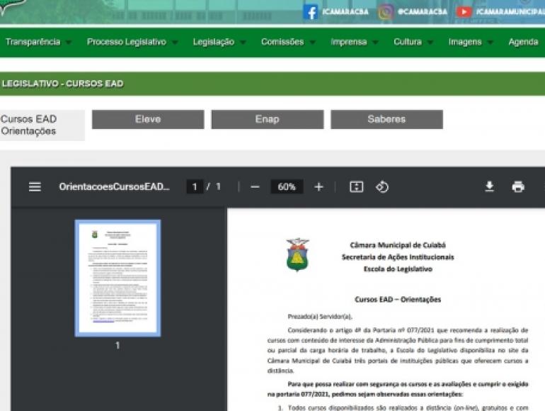Para facilitar o acesso dos servidores aos portais de cursos a distância, a Escola do Legislativo inseriu no site da Câmara Municipal de Cuiabá a opção "Cursos EAD" que abre uma página com listagem de instituições que disponibilizam aulas online, gratuitas e com emissão de certificado.&nbsp&nbsp