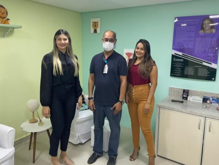 Acompanhado da primeira-dama do Legislativo Amabilla Camargo e a coordenadora da Sala da Mulher Jéssica Fernandes, o coordenador do banco de leite do Hospital Geral, Marcos Vinicius, esteve nesta segunda-feira (30.05), conhecendo a recém inaugurada Sala de Amamentação e a Sala da Mulher do Legislativo. O profissional destacou que a Casa de Leis de Cuiabá pode se tornar o primeiro espaço público a ter um ponto de coleta de leite materno.