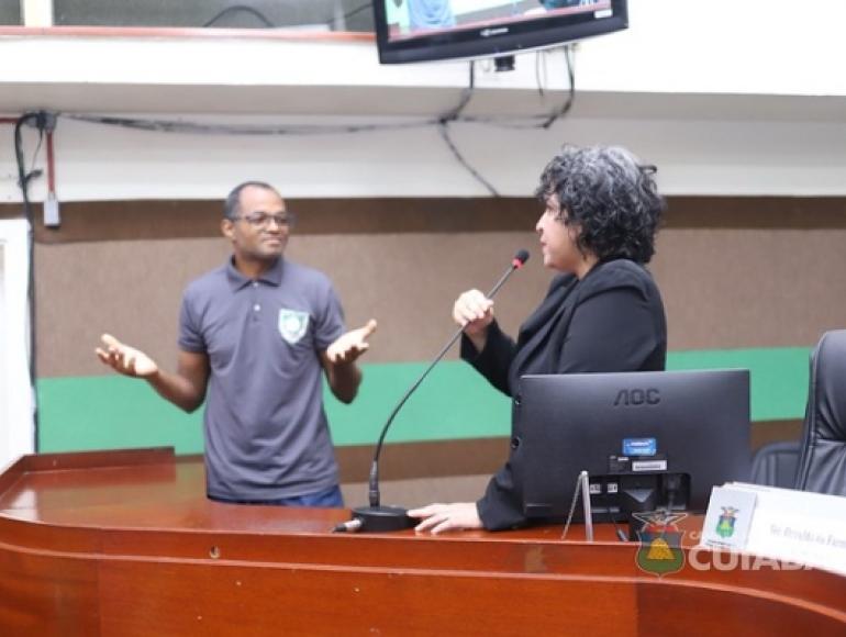Pela primeira vez na história do Parlamento Cuiabano, a Tribuna Livre – um espaço reservado à população durante as sessões plenárias da Câmara Municipal – foi utilizada por surdos e mudos. Na tribuna, a linguagem de sinais foi traduzida pela interprete da Câmara de Cuiabá, Rose Cinara.
