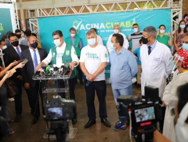 O presidente da Câmara Municipal de Cuiabá, Juca do Guarana Filho (MDB) e outros vereadores participaram do lançamento da campanha "Vacina Cuiabá – sua vida em primeiro lugar” de vacinação contra a covid-19. O ato foi realizado no Centro Evento do Pantanal, na manhã desta quarta-feira (20), onde sete profissionais da saúde que atuam na linha de frente de combate à pandemia foram vacinados.
