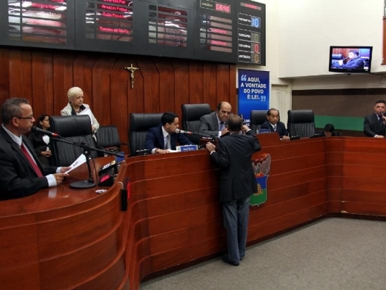 Mesa diretora e vereadores em debate