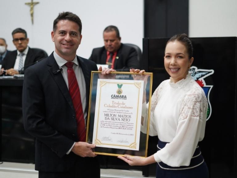 A vereadora Maysa Leão (Republicanos) concedeu ao promotor de Justiça Milton Mattos da Silveira Neto - titular da 7ª Promotoria de Justiça Cível Tutela Coletiva da Saúde de Cuiabá - o título de cidadão cuiabano.