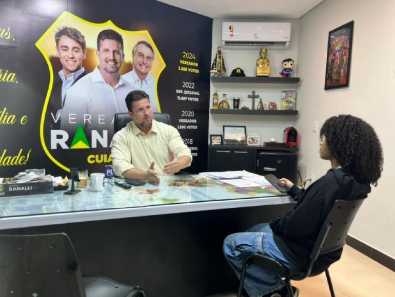 O vereador Rafael Ranalli (PL) recebeu em seu gabinete duas turmas do 2º ano do Instituto Federal de Educação, Ciência e Tecnologia de Mato Grosso (IFMT), campus Coronel Octayde Jorge da Silva, que estão desenvolvendo um trabalho escolar sobre a redução da maioridade penal para 16 anos, políticas públicas voltadas ao enfrentamento da violência juvenil e o sistema de cotas.