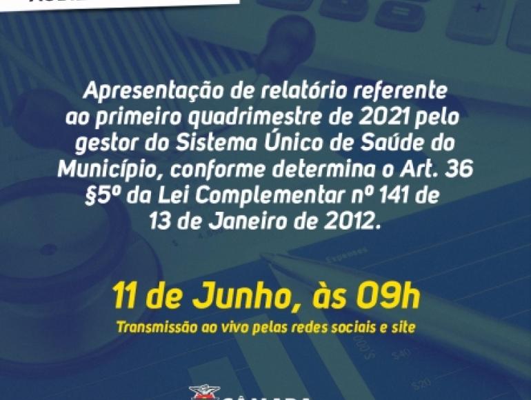 A Câmara Municipal de Cuiabá realiza nesta sexta-feira (11.06), a partir das 9h, uma audiência pública para que a secretária de Saúde, Ozenira Félix, e sua equipe  apresentem o relatório referente ao 1º quadrimestre de 2021 do Sistema Único de Saúde (SUS).