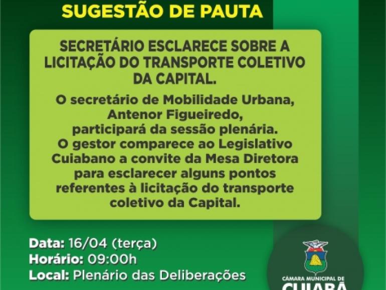 O gestor comparece ao Legislativo Cuiabano a convite da Mesa Diretora para esclarecer alguns pontos referentes à licitação do transporte coletivo da Capital.