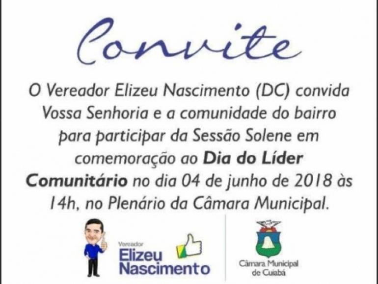 O vereador Elizeu Nascimento (DC) convida a população cuiabana para participar da sessão solene em comemoração ao dia do Líder Comunitário que será festejado hoje dia 04 de junho às 14h no Plenário da Câmara Municipal de Cuiabá.