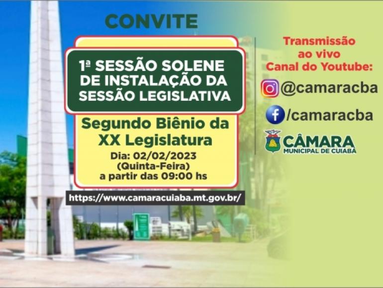 Na próxima quinta-feira (02), acontece a solenidade de Instalação da Sessão Legislativa Anual do Segundo Biênio da XX Legislatura, no Plenário das Deliberações, na Câmara Municipal de Cuiabá. A cerimônia terá início às 9h e será transmitida ao vivo na TV-Câmara, canal 3.3, no youtube @CamaraMunicipaldeCuiaba e na plataforma do facebook @camaracba.