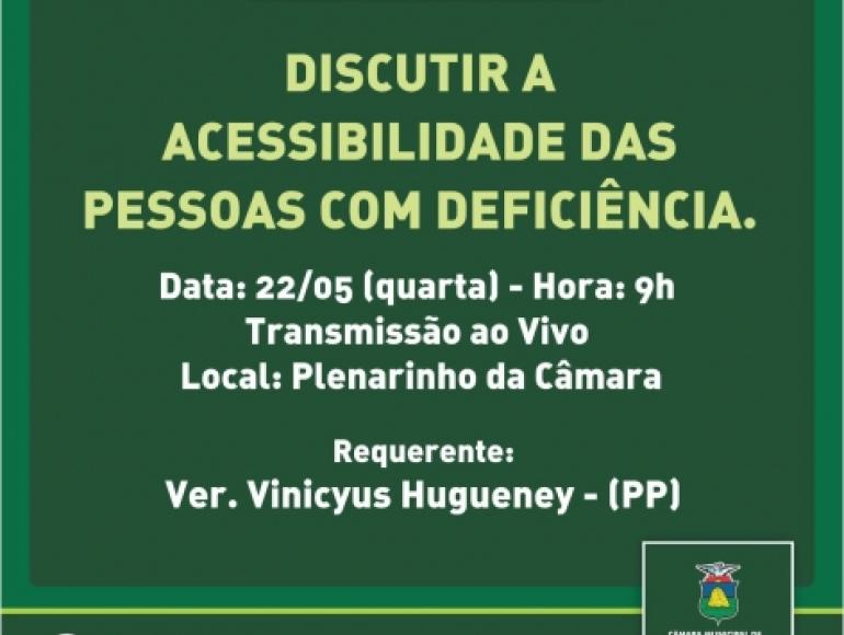 A Câmara Municipal de Cuiabá, por meio do vereador Vinicyus Hungney (PP), realiza nesta quarta-feira (22) uma audiência pública para debater as medidas apropriadas para garantir a melhoria na qualidade da acessibilidade e mobilidade das pessoas com deficiência.