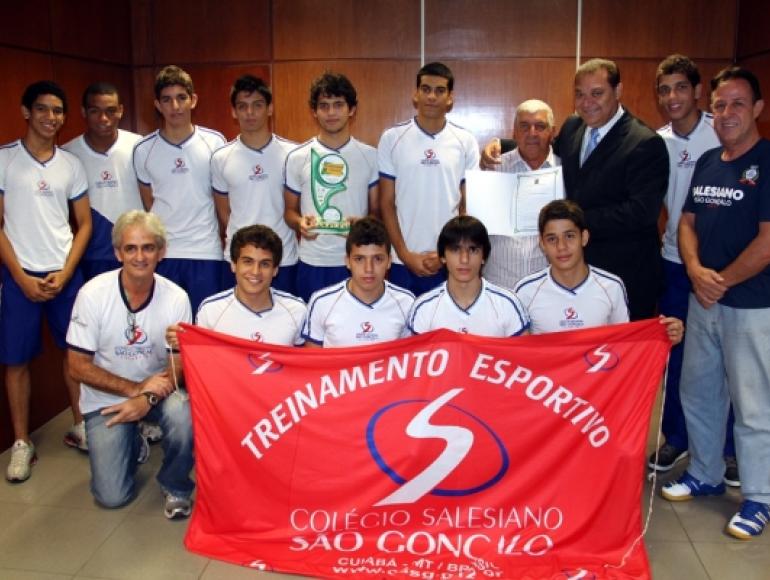 João Bosco e os atletas do futsal do Colégio Salesiano São Gonçalo, agora campeões brasileiros de futsal, juntamente com o técnico da equipe, Edson Manfrim, e o Coordenador Esportivo, João Bala, receberam das mãos do vereador Toninho a homenagem. A entrega é um reconhecimento pelo trabalho realizado e mais um incentivo, pelo trabalho que João Bosco vem fazendo pelo esporte amador.