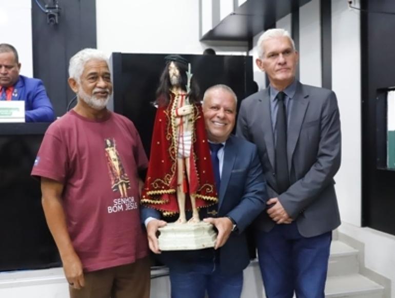 A Câmara Municipal de Cuiabá recebeu na Tribuna Livre desta quinta-feira (16), durante Sessão Ordinária, o convite para Festa do Senhor Bom Jesus de Cuiabá, por meio do padre Felisberto Samoel da Cruz, que levou a imagem peregrina ao Plenário. O padre foi convidado do vereador Mario Nadaf (PV).