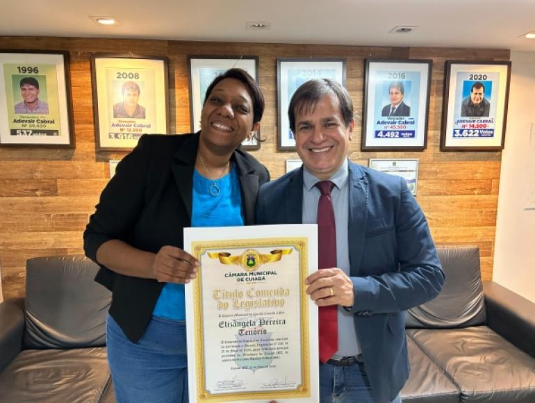 A Câmara Municipal de Cuiabá, por meio do vereador Adevair Cabral (Solidariedade), concedeu o Título Comenda do Legislativo à jornalista Elizângela Tenório. A honraria foi concedida de acordo com o Decreto Legislativo n° 239, de 21 de abril de 2024, em reconhecimento aos significativos serviços prestados pela homenageada à comunidade cuiabana.