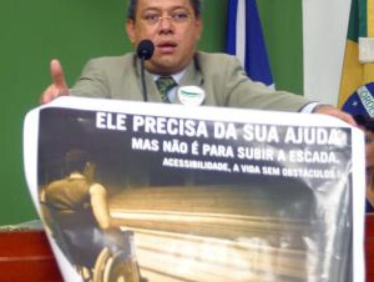 “Ele precisa de sua ajuda, mas não é para subir a escada”. Com este slogan, o vereador Mário Lúcio (PMDB) debateu em plenário e apresentou material de divulgação da campanha estadual lançada pelo Ministério Público (MPE), referente à acessibilidade, quando usou a tribuna na Câmara Municipal de Cuiabá. O parlamentar, que é presidente do Conselho Estadual da Pessoa com Deficiência teceu comentários e críticas referente à forma de construção civil, na maior parte das cidades brasileiras, que não dão acesso a pessoas com deficiências. Destacou a importância, de engenheiros repensarem o formato de seus projetos, quando os estiverem elaborando para a construção de edifícios. “Oferecer acessibilidade a uma pessoa não é apenas construir rampas, mas também outros tipos de facilidades, seja a pessoas de baixa estatura, respeitando altura de balcões de atendimento, orelhões (telefones públicos) e demais situações que deixem claro a não discriminação a quem quer que seja. Ninguém deve olhar de baixo para cima e sim, de forma igualitária”, ressaltou. Mário ainda destacou a importância, da existência de tradutores, nas Casas de Leis, como Assembléia Legislativa e na própria Câmara Municipal, no sentido de oferecer a todos, deficientes ou não, oportunidade de entender o que se passa em plenário. A Campanha Estadual lançada esta semana pelo Ministério Público visa atingir toda a sociedade mato-grossense e pretende sensibilizar no sentido de evitar a discriminação aos que possuem limitações, sejam elas decorrentes de doenças ou mesmo desde o nascimento.