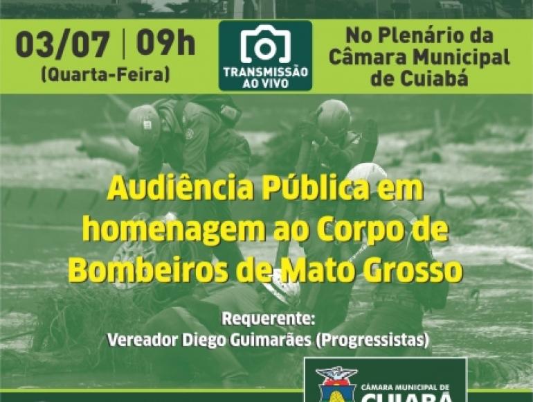 Audiência pública para homenagear a instituição Corpo de Bombeiros Militares do Estado de Mato Grosso. Na oportunidade, serão homenageados  16 oficiais que trabalharam na tragédia provocada pelo rompimento da barragem de rejeitos da mineradora Vale em Brumadinho. Outros dois, também receberão moção de aplausos, por terem prestado serviço na cidade de Beira em Moçambique, localidade afetada pelo ciclone Idai.