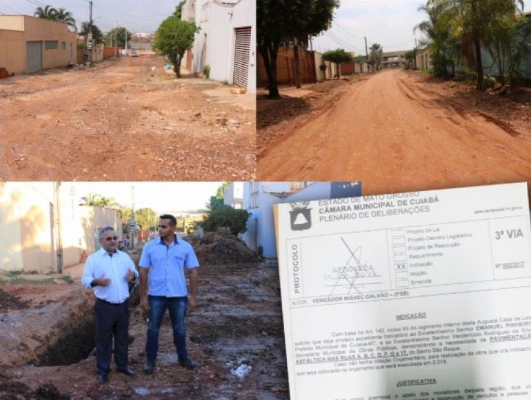 Após várias lutas, mesmo antes de se tornar vereador por Cuiabá, Misael Galvão vem trabalhando para viabilizar o asfalto ao bairro São Roque e logo que assumiu o mandato uma das primeiras Indicações (nº 001 e 002/17) foi o asfaltamento de 100% do São Roque e também as calçadas na porta da casa de cada morador do bairro.
