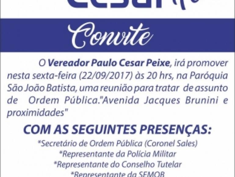 O Vereador Paulo Cesar Peixe – PSL, fará nesta sexta-feira,  22/09/2017, as 20hs, na Paróquia São João Batista, uma reunião com os moradores e empresários da região do Grande Terceiro e Jardim Europa, para tratar de assuntos de Ordem Pública, “Avenida Jacques Brunini e proximidades”.