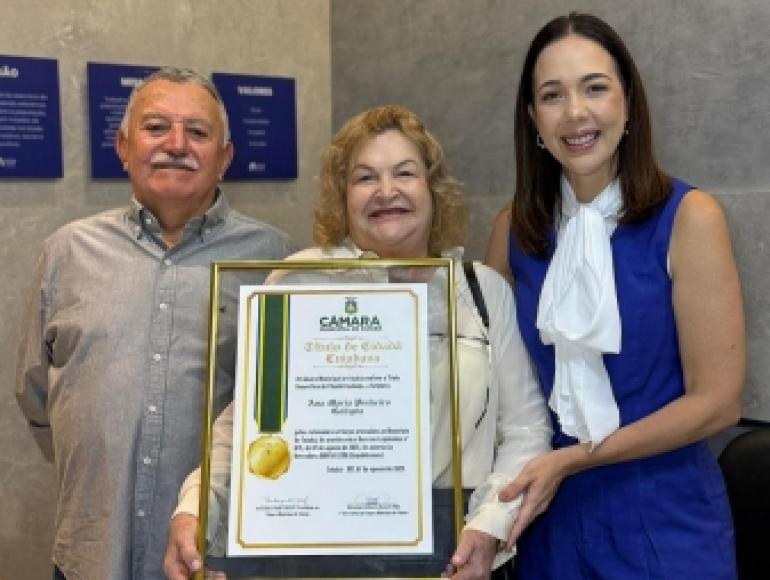 A vereadora Maysa Leão (Republicanos) entregou, nesta quinta-feira (04), o Título de Cidadã Cuiabana à professora Ana Maria Pinheiro Gahyva, em reconhecimento a sua trajetória de mais de cinco décadas dedicadas à educação pública.