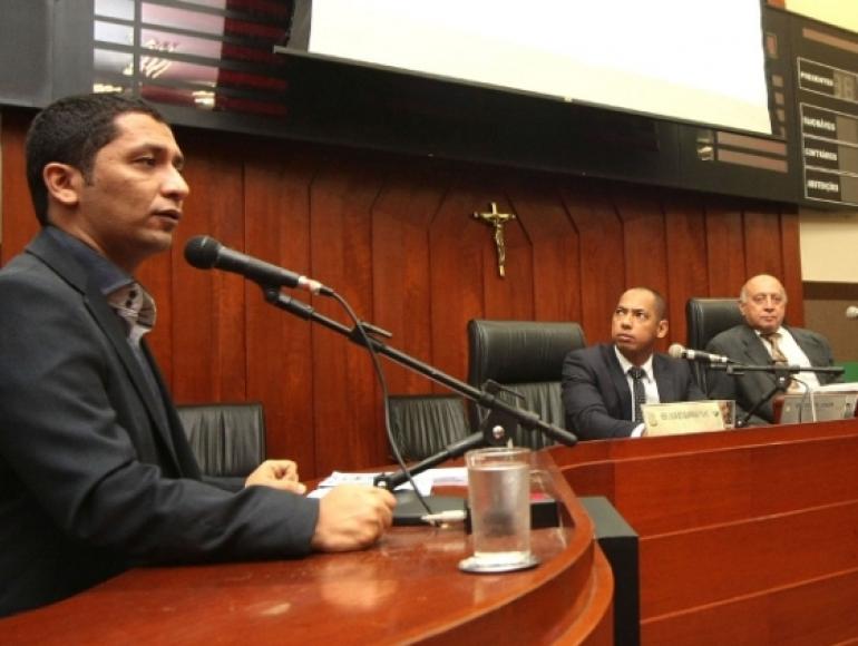 Em plenário, Werley Peres, secretário municipal de Saúde de Cuiabá, apresenta aos vereadores a estrutura logística e funcional de atendimento ao cidadão, desenvolvida pela sua equipe.